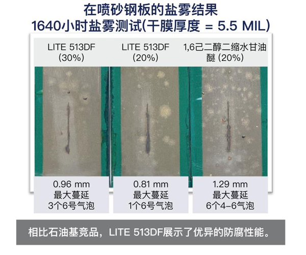 LITE 513DF是一款基于腰果殼油的新型高生物含量稀釋劑,它的環(huán)氧當(dāng)量比標(biāo)準(zhǔn)的513型號要低。這款產(chǎn)品適用于環(huán)氧涂料、單組分和雙組分粘合劑以及復(fù)合材料。LITE 513DF粘度低,具有優(yōu)異的稀釋能力,與雙酚A型液體環(huán)氧樹脂的添加重量曲線如圖所示。作為稀釋劑,它在環(huán)境溫度和低溫下具有良好的硬度發(fā)展。與其他腰果殼油改性的材料類似,LITE 513DF具有良好的耐水性和柔韌性。在涂料應(yīng)用中,LITE 513DF在長期鹽霧試驗(yàn)中表現(xiàn)出非常好的防腐性能,請見本頁面板的圖片。在粘合劑應(yīng)用中,這種環(huán)氧稀釋劑還可作為改性劑,提高伸長率和粘結(jié)強(qiáng)度,同時將對Tg和抗拉強(qiáng)度的影響降至低。