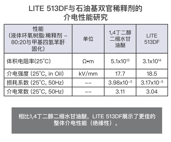 根據(jù)IEC 62631和IEC 60243標(biāo)準(zhǔn)進(jìn)行測試,如其介電性能所示,LITE 513DF提供了良好的絕緣性能。在Epon 828的配方中,樹脂的使用量為20%,用MTHPA(甲基四氫鄰二甲酸酐)固化,并用BDMA(芐基二甲胺)催化。LITE 513DF展示了優(yōu)異的結(jié)果,其體積電阻率和介電強(qiáng)度更高,損耗因數(shù)和介電常數(shù)比競品1,4丁二醇二縮水甘油醚更低。當(dāng)兩種稀釋環(huán)氧樹脂體系都暴露于高溫或鹽溶液中時,LITE 513DF的性能優(yōu)于石油基雙官能稀釋劑。LITE 513DF是一款良好的環(huán)氧稀釋劑和改性劑,適用于電氣灌封、鑄造和封裝(浸漬樹脂)。