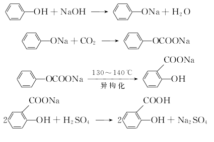將酚用50%液堿中和,真空干燥,然后將釜溫冷卻至100℃,慢慢通入干燥的二氧化碳,當(dāng)釜內(nèi)壓力達(dá)0.7-0.8Mpa時(shí),停止通二氧化碳,此時(shí)生成碳酸酚酯鈉,然后在130-140℃下發(fā)生分子內(nèi)重排異構(gòu)化,變?yōu)樗畻铘肉c,再用酸化,得水楊酸粗品。將粗品在減壓下升華,即得水楊酸精品,含量99%,收率達(dá)98%以上。消耗定額(kg/t):酚(98%)704,燒堿(95%)417,(95%)500,二氧化碳(99%)467。 (3)制法 酚與氫氧化鈉反應(yīng)生成酚鈉鹽,然后再與二氧化碳合成鄰羥基甲酸鈉,經(jīng)酸化制得水楊酸: