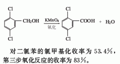 2.氯甲基化法由對(duì)二氯與多聚甲醛作用,再經(jīng)高錳酸鉀氧化而得。對(duì)二氯的氯甲基化收率為53.4%,第三步氧化反應(yīng)的收率為83%