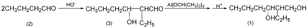 2-乙基-3-羥基己醛(3):于裝有攪拌器、溫度計、滴液漏斗的反應(yīng)瓶中,加入正己醛(3)260g(3.6mol0),150mL,冰鹽浴冷卻至-3℃,開始滴加30mL(10%)的醛氧化鉀溶液,開始時滴加要緩慢,以防溫度超過8℃。約3h加完。加完后再攪拌反應(yīng)5h。分出有機層,水洗三次,無水鈉干燥?;厥?,減壓蒸出低沸物,得粗產(chǎn)品2-乙基-3-羥基己醛(3)200~220g。2-乙基-1,3-己二醇(1):于裝有攪拌器、回流冷凝器的反應(yīng)瓶中,加入鋁屑33g(1.2mol),無水異丙醇300mL,加入碘0.1g,水浴加熱,生成異丙醇鋁,并有大量氫氣放出,當(dāng)大部分的鋁參加反應(yīng)后,再加入無水異丙醇300mL?;亓?h以使反應(yīng)完全。反應(yīng)體系呈深灰色。冷后加入前面制得的2-乙基-3-羥基己醛(3),安上有填充物的分餾柱,不斷蒸出生成的丙酮。隨著反應(yīng)的的進行,丙酮逐漸蒸完,異丙醇蒸出,直至柱頂溫度達到80℃(此時為異丙醇,可回收再利用)。冷卻,以15%的烯調(diào)至弱酸性,有油狀物析出。分出油狀物,水洗三次,無水鈉干燥,而后進行分餾,收集238~242℃的餾分,得2-乙基-1,3-己二醇(1)60g,收率23%。[1]