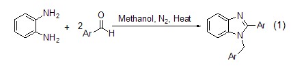 鄰二胺和兩當(dāng)量的芳香醛在甲醇中反應(yīng)時(shí),生成相應(yīng)的五元氮雜環(huán)的并咪唑衍生物 (式1)[3]。