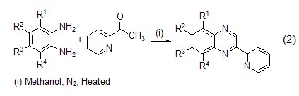 鄰二胺與2-吡啶甲醛反應(yīng)時(shí)得到的是N4席夫堿配體1[1],但是當(dāng)把2-吡啶甲醛換成2-乙?;拎r(shí),以氯甲酸甲酯為催化劑,在異丙醇中反應(yīng)沒有得到相應(yīng)的N4席夫堿配體2,而是得到了并六元環(huán)產(chǎn)物即2-(2′-吡啶基)喹喔啉3[2]。