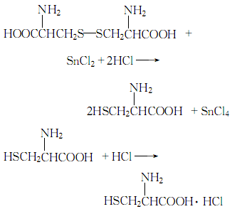 1.將胱氨酸溶于稀鹽酸中,過濾加入錫粒升溫回流。將還原液用水稀釋,移去剩余錫粒,通過硫化氫使飽和,過濾,濾渣用少量水洗,將洗液、濾液合并,減壓濃縮,冷卻結晶,干燥得鹽酸L-半胱氨酸。